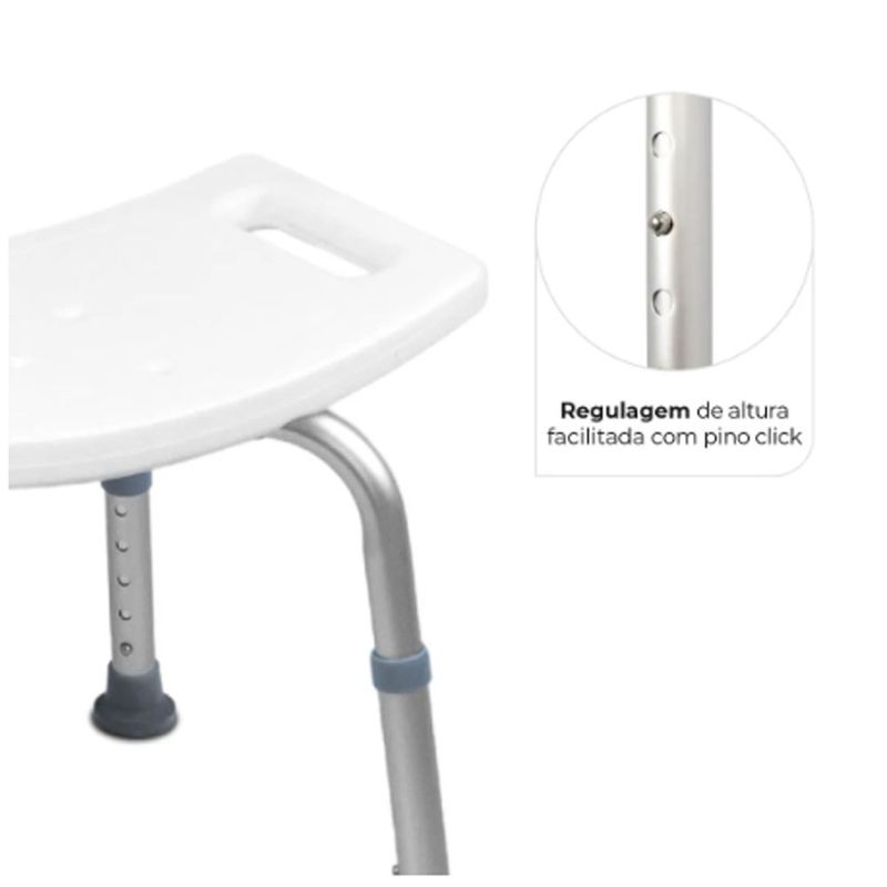 Ideal para pessoas com limitações de movimentos e que necessitam de segurança no banho, a banqueta de banho D1 possui corpo de alumínio anodizado e assento curvo e ergonômico com encaixe de mãos e aberturas para escoar a água. Sua regulagem de altura é facilitada com pino click.